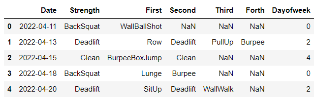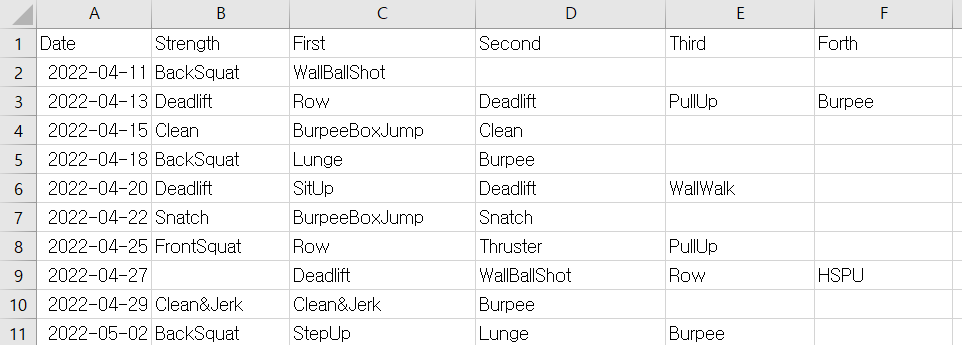 Date칼럼은 날짜를 나타내고, Strength칼럼은 해당 날짜에 진행한 Strength 동작을 나타낸다.