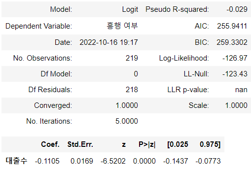 logit = sm.Logit(df['흥행 여부'],df['대출수']) #로지스틱 회귀분석 시행