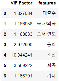 vif["VIF Factor"] = [variance_inflation_factor(df[['대출수', '국내/외국', '도서 연도', '동화', '소설', '희곡', '기타']].values, i) for i in range(df[['대출수', '국내/외국', '도서 연도', '동화', '소설', '희곡', '기타']].shape[1])]