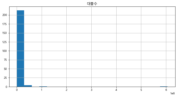 df[['대출수']].hist(bins=20, figsize=(10,5))