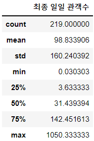 > 흥행의 기준을 선정하기 위해 종속변수인 최종 일일 관객 수의 기초통계량을 확인한다.