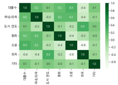 > 도서 연도 컬럼은 '현대', '근대, '고전'을 각각 0, 1, 2로 변환하고, 국내/외국 컬럼은 '외국', '국내'를 각각 0, 1로 변환하고, 원작 세부 장르 컬럼에 대해서는 더미 변수를 활용해 변환했다.