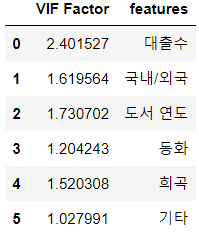 vif["VIF Factor"] = [variance_inflation_factor(df[['대출수', '국내/외국', '도서 연도', '동화', '소설', '희곡', '기타']].values, i) for i in range(df[['대출수', '국내/외국', '도서 연도', '동화', '소설', '희곡', '기타']].shape[1])]