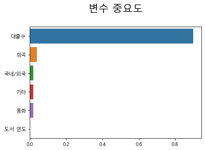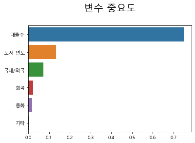 > 희곡 - 국내/외국 - 동화 - 도서 연도 - 대출 수 - 기타 순으로 중요도에 대한 수치가 나타나고 있다.