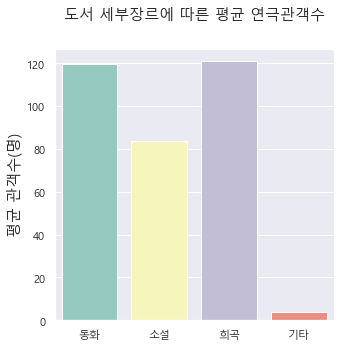 g.set_title('도서 세부장르에 따른 평균 연극관객수',fontsize = 15, pad=30)
