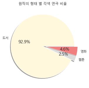 > 원작의 형태별 각색 연극 비율에 대해서 인사이트를 도출하기 위해 파이차트를 통해서 시각화해보았다.