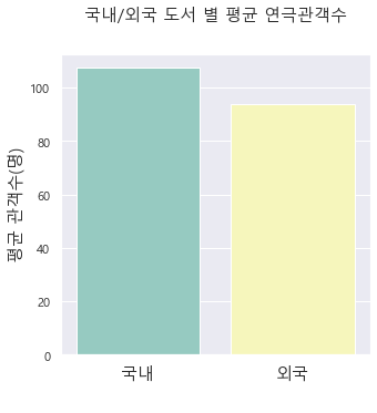 > 국내/외국 도서 별 평균 연극 관객 수에 대한 시각 자료를 통해 인사이트를 도출하고자 한다.