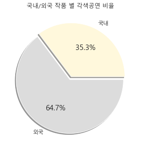 > 마지막으로 국내/외국 작품 별 각색 공연 비율에 대한 시각 자료를 보고 해석해보고자 한다.