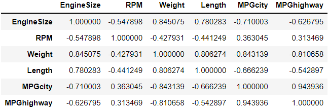 > MPGcity변수와 MPGhighway변수가 약 0.94의 높은 양의 상관관계를 보이고 있다.
