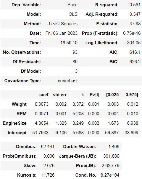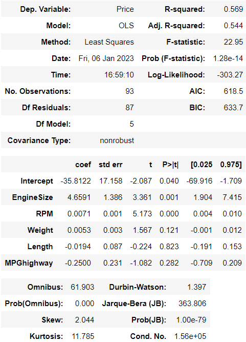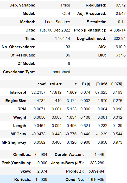 model = smf.ols(formula ='Price ~ EngineSize + RPM + Weight + Length + MPGcity + MPGhighway', data = Cars)