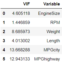 > 결과를 보니 MPGcity변수가 VIF값이 약 13.6으로 MPGhighway변수보다 높으므로 MPGcity변수를 제거해야겠다는 생각이 든다.