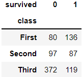 > 테이블을 보면 확인할 수 있듯이 생존여부에 따른 객실 등급을 한눈에 확인할 수 있다.