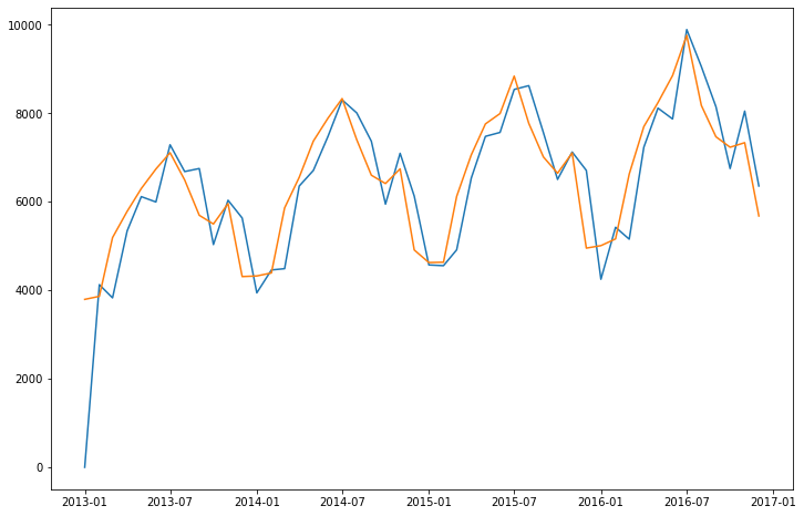 > 파란색 그래프가 ARIMA모형에 의해 예측된 값이고, 주황색 그래프는 원본데이터 값을 표현하고 있다.
