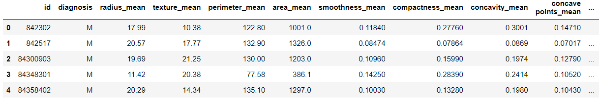 > breast.head()를 통해서 데이터의 전반적인 모습을 확인할 수 있다.
