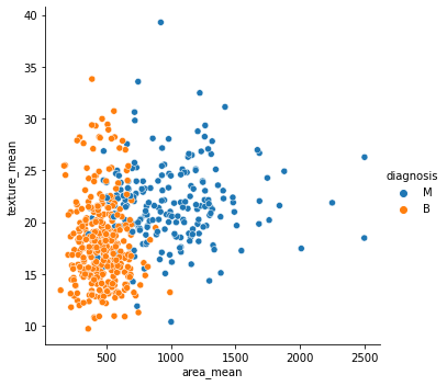 > 분석을 위해서 독립변수를 area_mean, texture_mean변수로 한정하고, 독립변수와 종속변수 사이의 관계를 살펴보기 위해 산점도를 띠워본다.