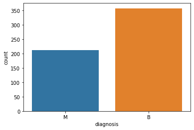 > 종속변수인 diagonosis 변수에 대해서 분포를 확인하고자 시각화해보았다.