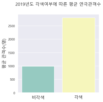 g.set_title('2019년도 각색여부에 따른 평균 연극관객수',fontsize = 15, pad=30)