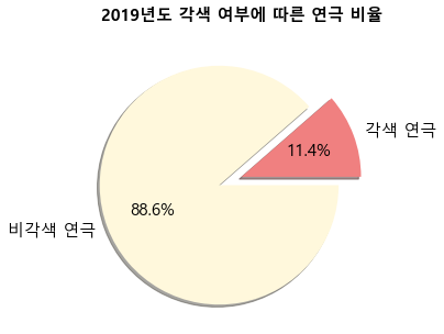 plt.title('2019년도 각색 여부에 따른 연극 비율', fontdict=title_font)